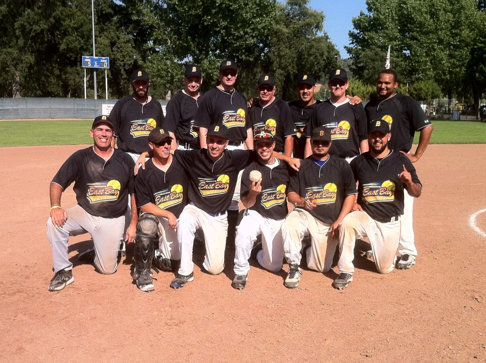 East Bay Bashers, champions at Sonora, CA, July 15, 2012; Left To Right: Bottom Row: Chris Wright, Dave Cavalier, Thomas Gaide, Johnny Rodriguez, Joe Berberena, Fabian Pantoja; Top Row: Matthew Roeber, Dave Anderson, Dave Carlton, Fred Williams, Wil Wright, Mike Woods, Monty Wells; Matthew Christiansen, Jenner Christiansen,