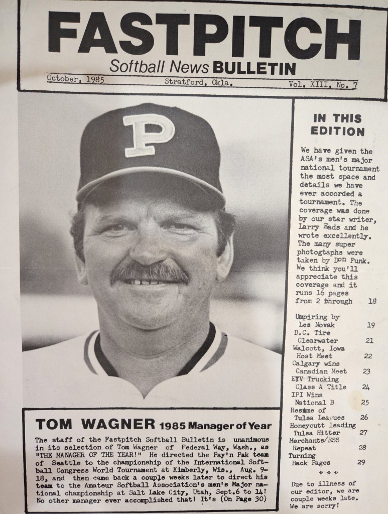 Call this one the “Pay ‘n Pak” issue, the World and National Champions of 1985. On the front cover is a photo of Pay ‘n Pak manager Tom Wagner, whose Seattle Washington based team became the first to win both the ISC World Tournament and ASA National Championship in the same year. (a feat most recently accomplished by the New York Gremlins in 2023, headed up by skipper Gregg Leather. )