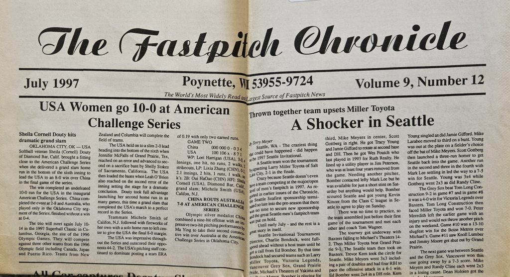 This week’s Throwback Thursday features snippets of the July 1997 edition of Bob Tomlinson’s Fastpitch Chronicle, “the” men’s fastpitch newspaper of record before the internet. Still working on a way to scan the newspaper-sized pages, but for this post, we’ve photographed a few articles from that issue.