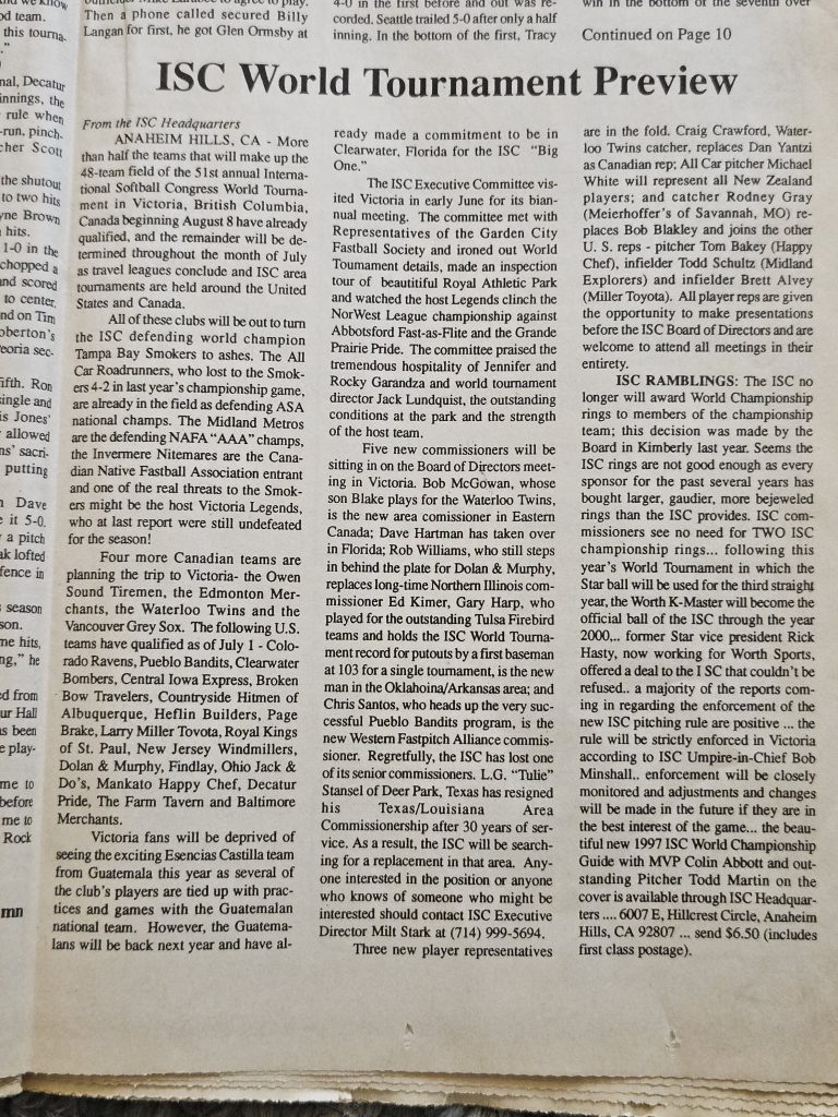 Also appearing in that July 1979 issue of the Fastpitch Chronicle was the (1997) “ISC World Tournament Preview”, the month before the 1979 ISC World Tournament held in Victoria British Columbia Canada, not far from the site of the upcoming 2024 ISC World Tournament (#ISCWT2024).