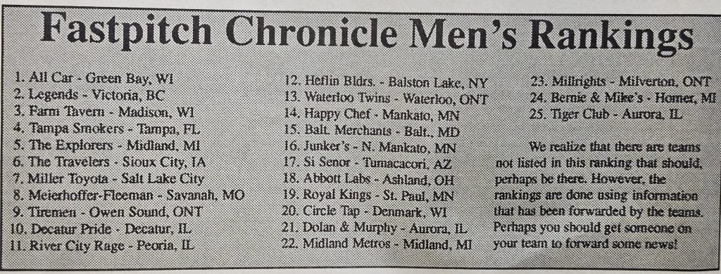 Also appearing in the issue were the Fastpitch Chronicle Men’s Rankings. Compare to the final results a month later by click the “Recap here” link above.
