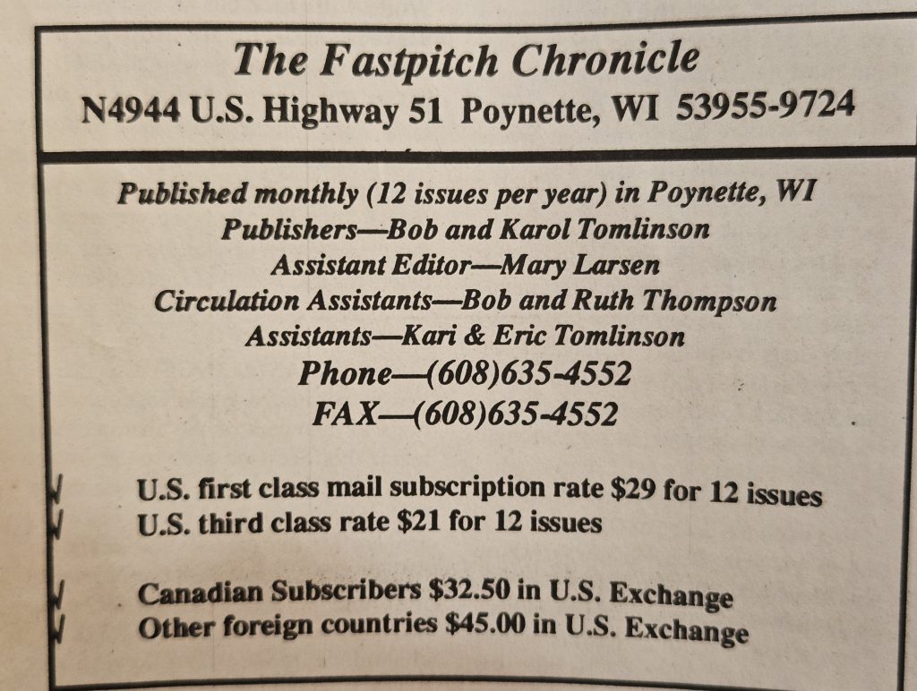 The Masthead of the Fastpitch Chronicle, published by Bob Tomlinson and his staff, from Poynette Wisconsin. included Publishers Bob and Karol Tomlinson, Assistant Editor Mary Larsen, Circulation Assistants Bob and Ruth Thompson and Assistants Kari and Eric Tomlinson. Subscriptions in 1979 were $29 for 12 issues, slightly higher to countries outside the USA.