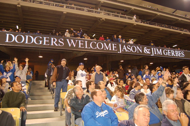 Jason and his dad Jim were in Los Angeles on business recently, and managed to squeeze in a trip to Dodger Stadium, with Maddy and I. Jason had never been to a major league baseball game before, but is a big Dodger fan. As you can see from the photo, the Dodgers sent along a nice welcome. (That’s Jason standing, with the Dodger jersey) Jason, his dad and Maddy also wound up on the Diamondvision scoreboard in left field. No telling why they left me off 😉