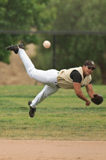 . You don't tug on Superman's cape: David Carrillo of Liberty Fastpitch goes sky high to make a catch Saturday at Santa Barbara