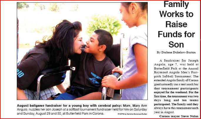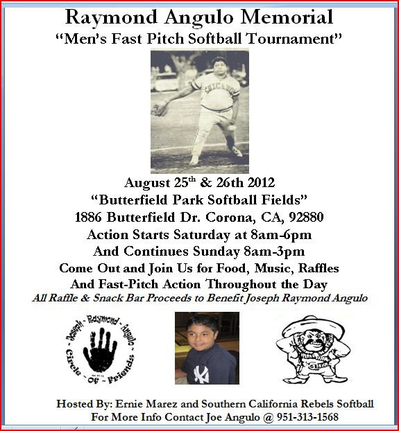 The Raymond Angulo Memorial Tournament is hosted by Ernie Marez and the So Cal Rebels, Corona, California. Each year this tournament helps raise money for 10-year old Joseph Raymond Angulo, a little boy who suffers from cerebral palsy. For an earlier newspaper story about young Joseph, click here.
