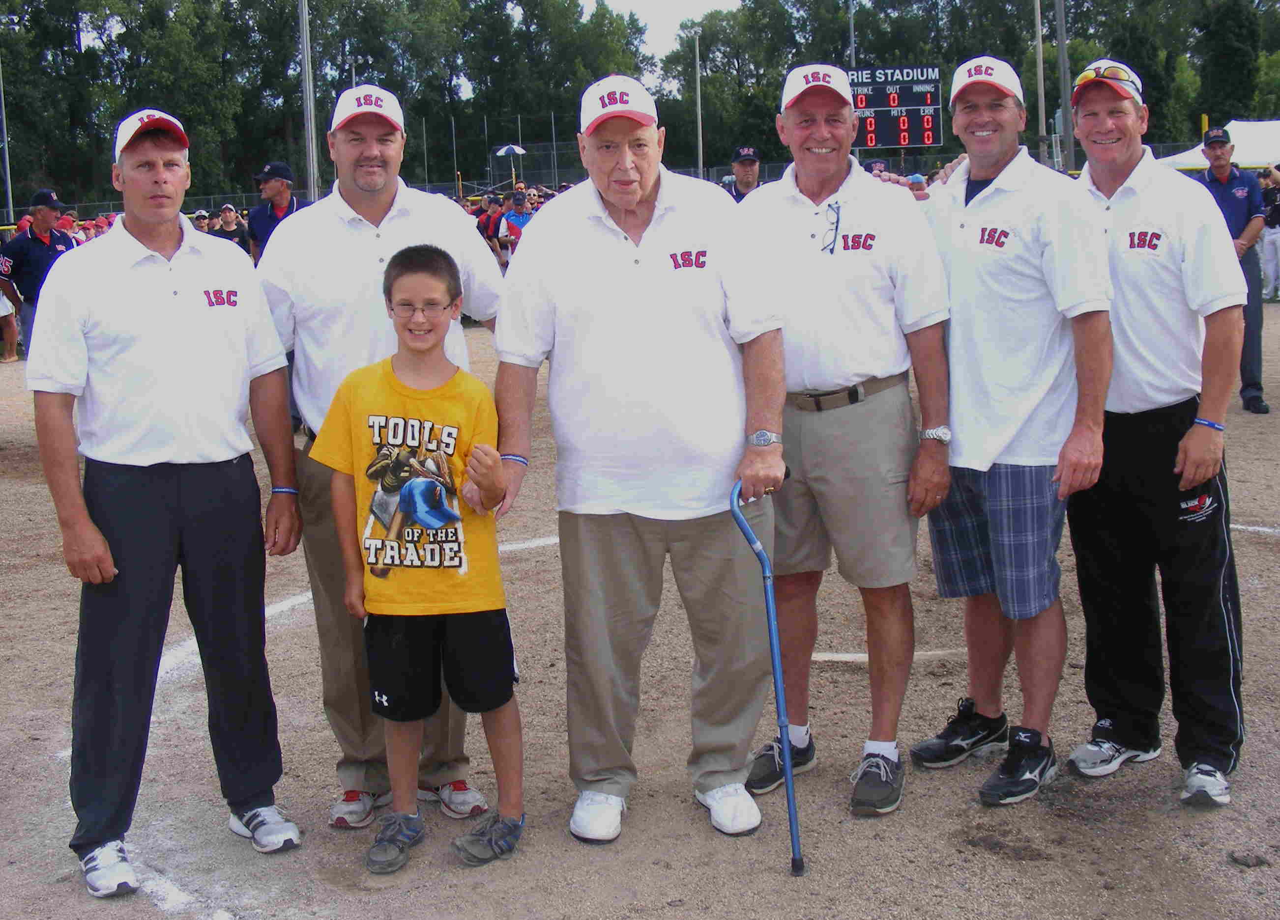 During opening ceremonies at Currie Stadium in Emerson Park, Midland MI on Sunday evening August 12, 2012, the ISC Hall of Fame Class of 2012 inductees were donned in the sartorial splendour of their white HoF attire (shirts and caps) while displaying their personalized plaques, to be introduced and acknowledged by the teams and fans. Inductees included (l-r) Adam Smith (Hagersville ON), Shawn Rychcik (Salamanca NY), John Miller (Green Bay WI) accompanied by his grandson Brennen Miller, Dick Mason (Littleton CO), Todd Budke (Lancaster CA) and Paul Algar (Lexington IL) Patrons for the inductees included: AC Liquidation/Les Cigel/All Car Roadrunners, Green Bay WI (Shawn Rychcik) Fireman Lawyers, Toronto ON (Adam Smith) Haynie & Company, Littleton CO (Dick Mason) Kitchener Fastball Promotions, Kitchener ON (Paul Algar) Legends of Fastball Tournament, Kitchener, ON (Todd Budke) The Bar - Appleton, Green Bay, Oshkosh and Wausau WI (John Miller)