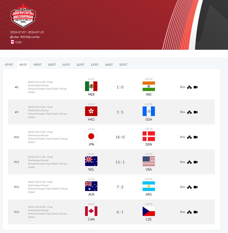 Day 2 Scores from the 2018 WBSC Jr. Men’s World Championship at Prince Albert, Sasketchewan July 9, 2018 by fpw Good crowd on hand Sunday night for Canada vs. Czech Republic (click to enlarge)